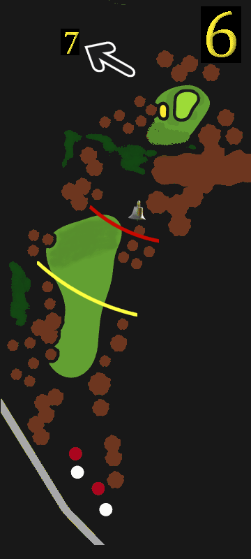 On the 6th, it is generally best to lay up well short before the slope steepens up. Wait for the game in front to ring the bell, or walk forward and check it is clear. The little bunker to the left of the green will pull in anything short and even a whisker left, so aim mid-green.