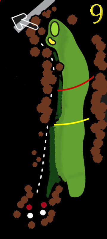 Long hitters can get this one very close – in summer just aim at the 10th tee and let the slope run you all the way home! For the rest of us, the slicker the fairway, the higher up the hill you need to start the ball, and it will still finish in the left-hand semi. The one place not to be off the tee is stuck on the steep bank on the left.