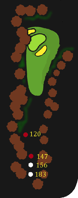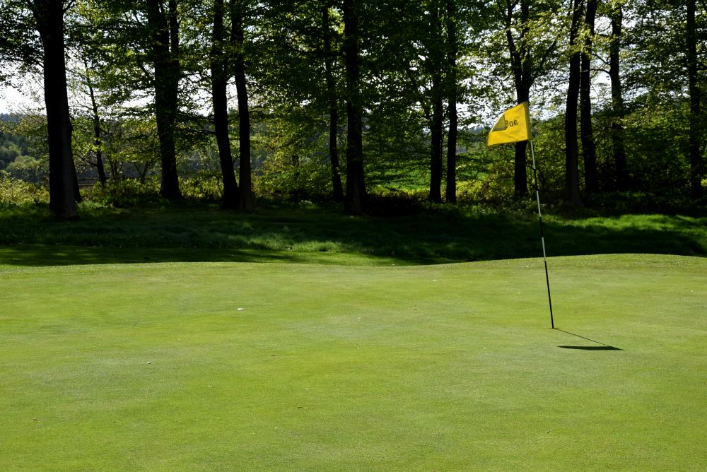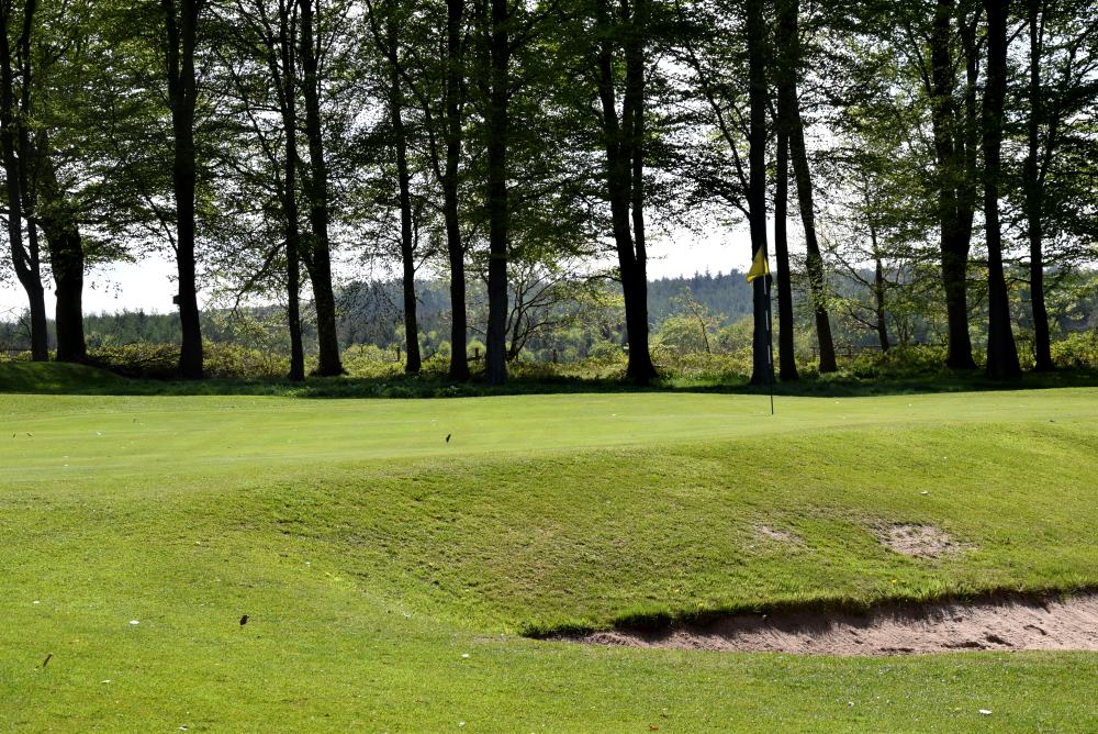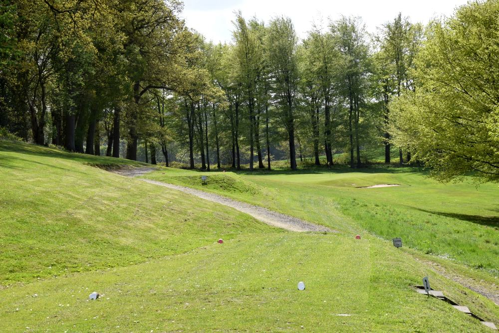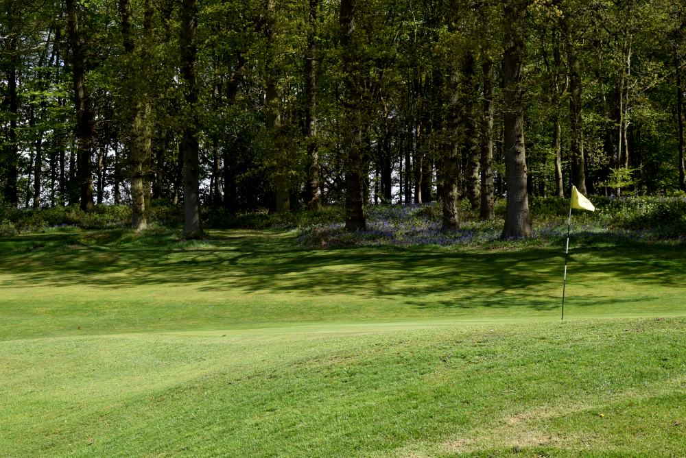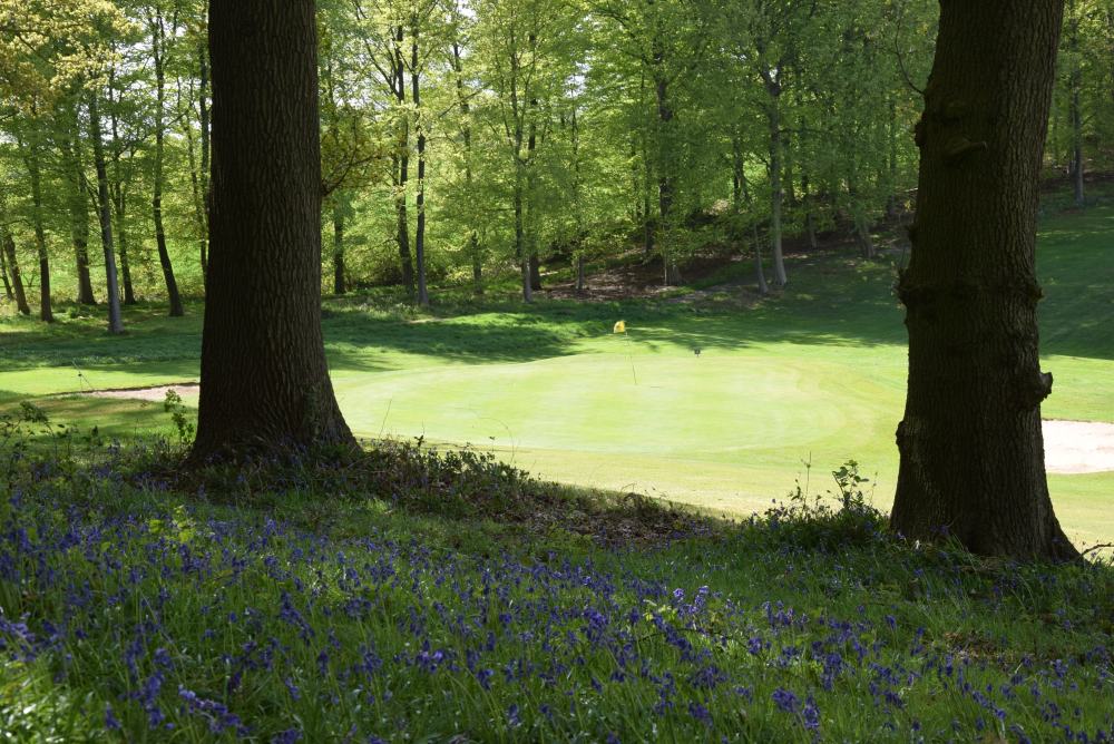 In Bluebell season, the prettiest hole on the course. This looks downhill, but the whole valley slopes towards you so it is actually almost level. A lot of balls finish short and right here!