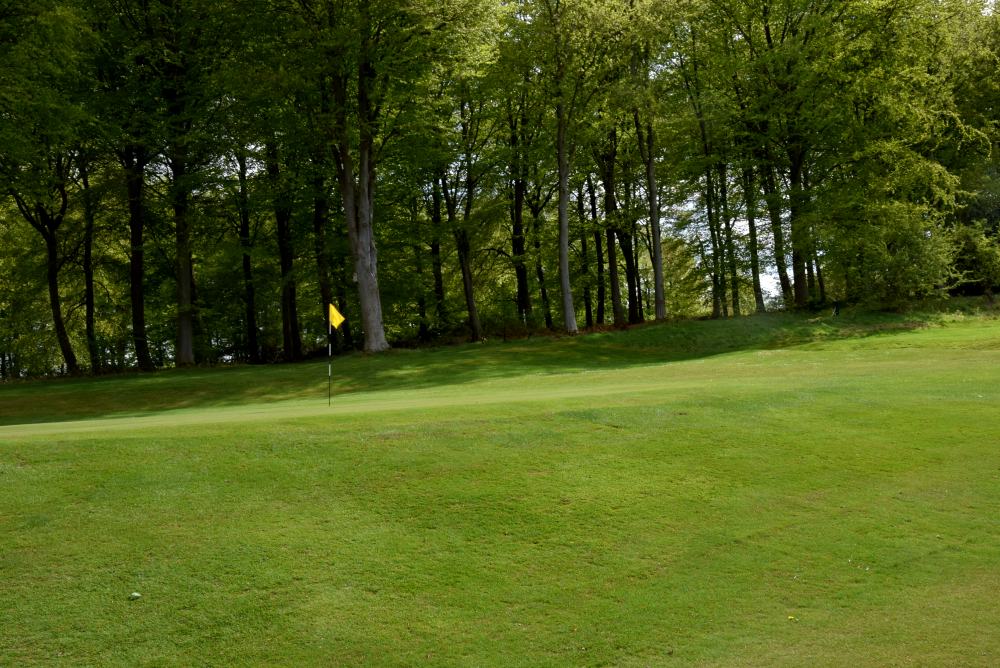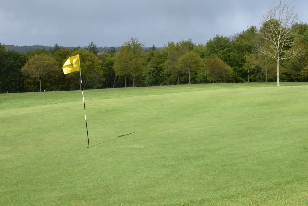 Quite a long shot in, but if it is hard and running, that could be an advantage. Anything left of the flag will get kicked off to the low side by the slope. Anything right will almost certainly finish sandy (or in the trees).