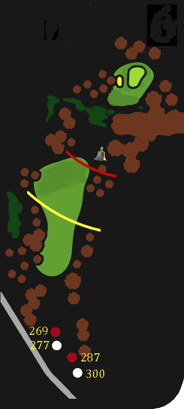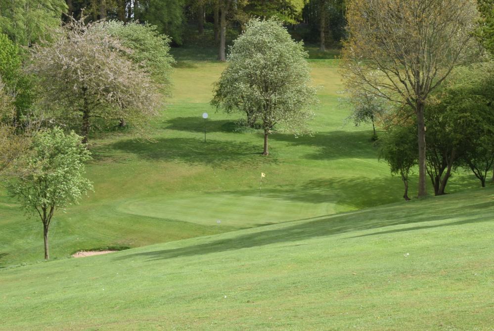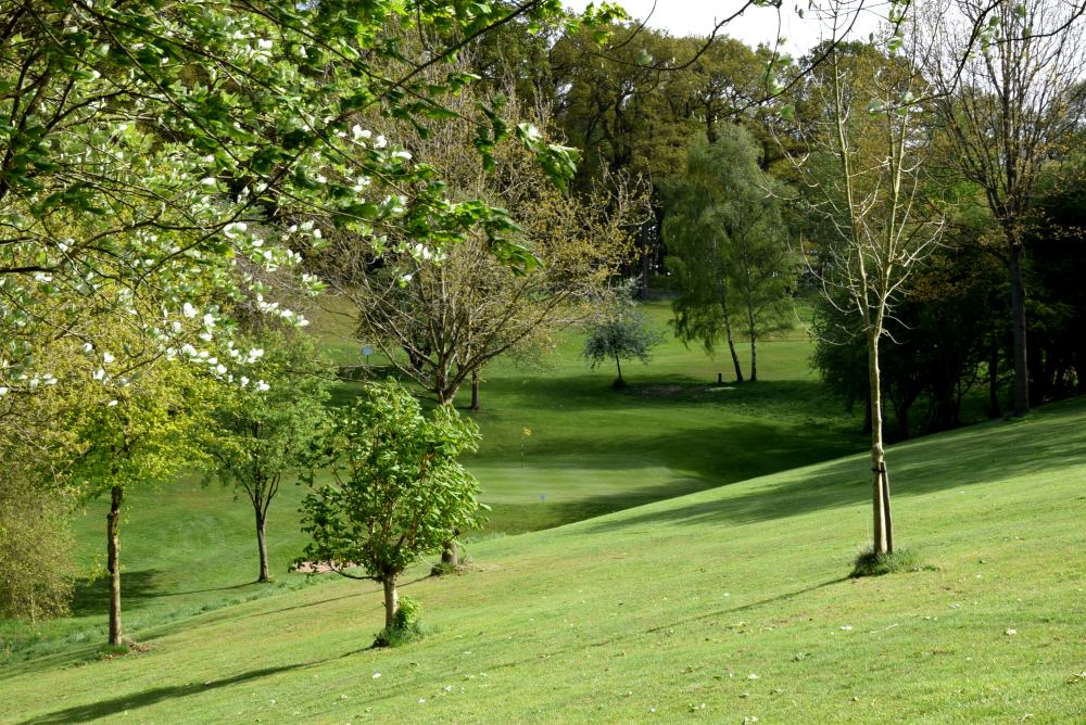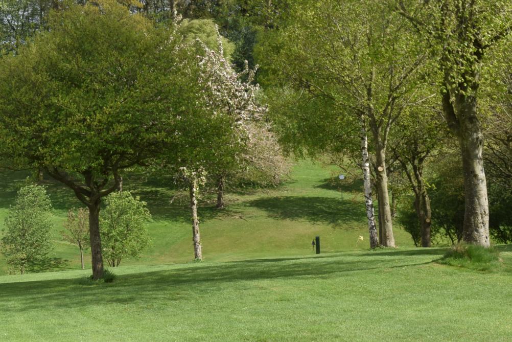 Better walk forward and check its clear before we tee off here! The post was set up for the old tee (on the left) so the best line here is to that far copper beech. Dont out-hit it though - in summer you can easily run off the end of the fairway and get well trapped in the left-hand trees.