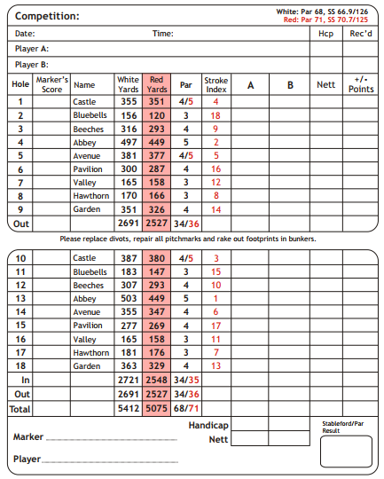 Our WHS ratings are 66.9/126 (white tees for men) and 65.3/122, 70.7/125 (red tees for men and women). The white course record of 67 is currently held by Tim Smith (Club Championship 2017).